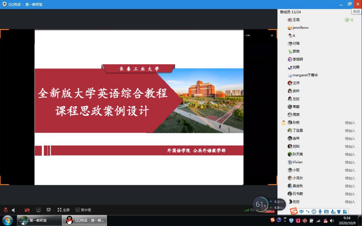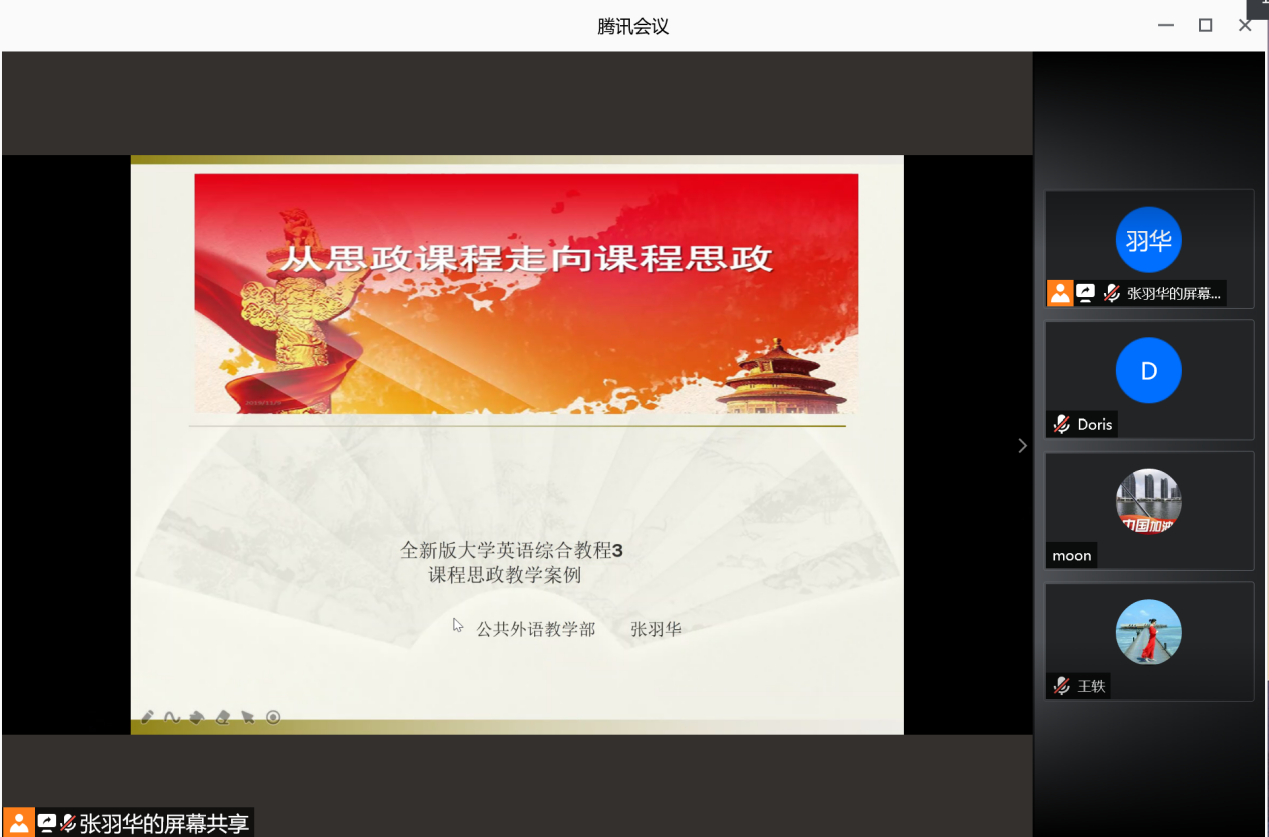 研讨会上,大学英语第一教研室、第二教研室、第三教研室和国际教育教研室分别由王旭、张羽华、李秀文和李宏四位教师针对各自教研室不同的课程内容进行课程思政设计展示。大学英语第一教研室、大学英语第二教研室依托全新版大学英语综合教程第一册、第三册展开课程思政建设。根据文章内容,引导学生深入了解社会主义核心价值观,从而树立正确的世界观和人生观。从不忘初心,到实现梦想。大学英语第三教研室从英语课程思政教学指南,课程思政教学目标,课程思政案例设计、课程思政创新特色、探讨育人成效等几个方面讲解了如何科学设计课程思政教学内容,将课程思政融入大学英语课堂教学建设全过程。大学英语国际教育教研室进行了托福课的课程思政展示。通过对托福考试的辅导,培养学生的英语综合知识与应用技能,跨文化交际能力及自主学习能力,使学生在今后的学术研究中能用英语进行有效的学习,提高综合文化素养,尊重科学知识,正确处理中外文化关系,弘扬社会主义核心价值观,以适应我国社会发展和国际交流的需要。