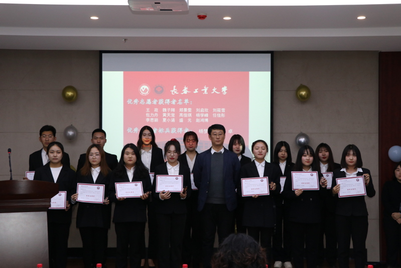 换届大会后,对2020年抗疫优秀志愿者进行表彰,党委副书记王颖群为梁卓,杨梦雪两位优秀志愿者标兵颁奖,团委书记朱博、学生党支部书记刘明慧,为王政,高佳琪等十四名优秀志愿者颁奖。