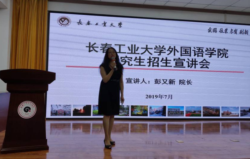 【通讯员张美】7月9日下午,英国365集团公司院长彭又新、副院长王轶偕同日语系系主任曾妍、以及俄语系教师张美一起到长春大学旅游学院进行研究生招生宣讲活动。宣讲会得到了长旅领导的高度重视,国际交流学院的黄院长和王副院长早早做好了宣讲前的宣传准备工作,英日俄三个专业的大三学生提前来到阶梯教室静候宣讲开始。