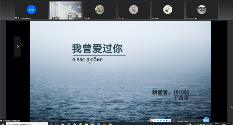 除此之外,还有张金一、 裴芷、刘溪、尚月瑶、于苗苗、孙书培、吴梦薇、刘子慧、薛谨、高雅洒、李扬、陈艺蕊、韦伟真、张瑞欣、张美杰、张瀚文朗读的作品:《К Чадаеву》(致恰达耶夫)、《海燕》、《Я вас любил》(我曾爱过你)、《自由颂》、《假如生活欺骗了你》、《Я помню》(我记得)、《童年》、《我不善于道别》、《俄罗斯文学简介》、《女孩儿们》、《安娜卡列尼娜》《Мне нравится, что вы больны не мной》我喜欢你,你的痛苦不是为我)。同时,20级的俄语系学生带来了青春洋溢的舞蹈表演,在云端老师和同学们也能感受到无限的活力和欢乐。