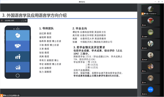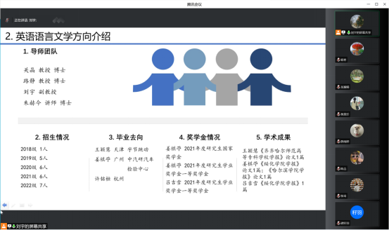 随后,她向同学们介绍了英国365概况、英语专业的发展历程和取得的成果。全面地介绍了这两个方向的导师团队、近年的招生情况、毕业去向、奖学金评定规则,并讲解了个人培养计划,让同学们明晰培养目标和课程安排。在师生互动环节,详细解答了同学们的疑问,拉近了师生之间的距离。