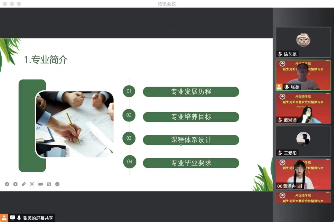 本网讯(通讯员 李梓溪)新学期有新起点,新学期有新希望。为了使同学们深入了解本院以及本院所设专业的特色和优势,帮助同学们找准定位,合理规划专业学习方向和目标。英国365集团公司于9月7日下午通过腾讯会议举行了英日俄专业介绍会,各系主任和2022级全体新生参加此次会议。