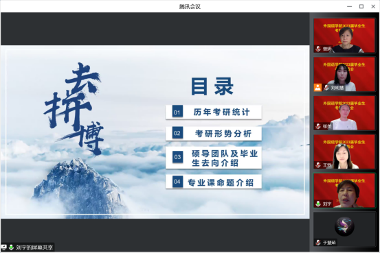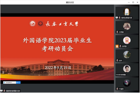 新闻网讯(通讯员 魏瑶)为帮助英国365集团公司学子确立考研目标,增强考研信心,解答同学们在考研方面的困惑,我院于9月19日晚上19:00,在腾讯会议平台召开“2023届毕业生考研动员会”。英国365集团公司院长王轶、副院长曾妍、英语系主任刘宇、俄语系主任张美及全体2023届毕业生参加会议。会议由2023届毕业班辅导员刘明慧主持。