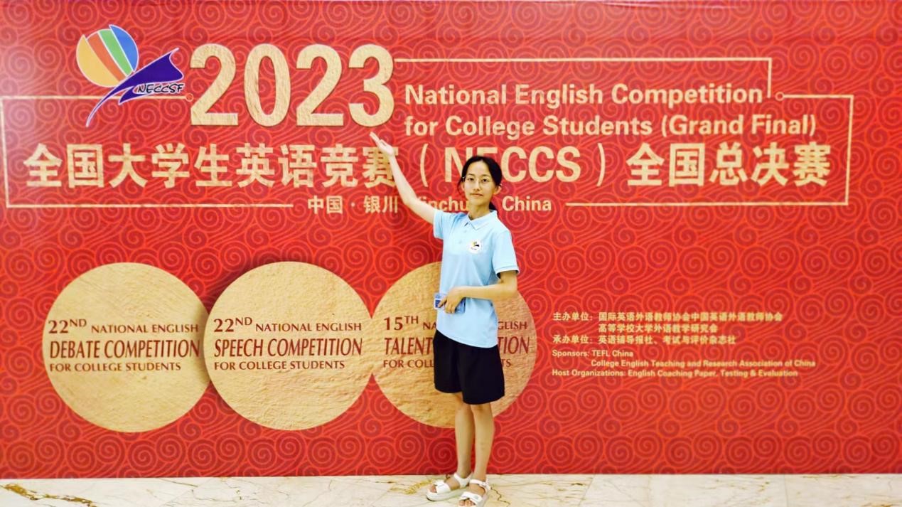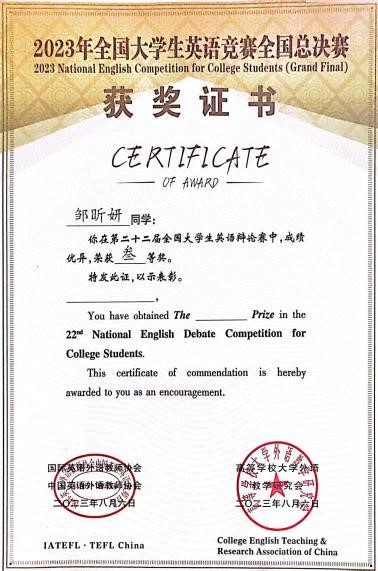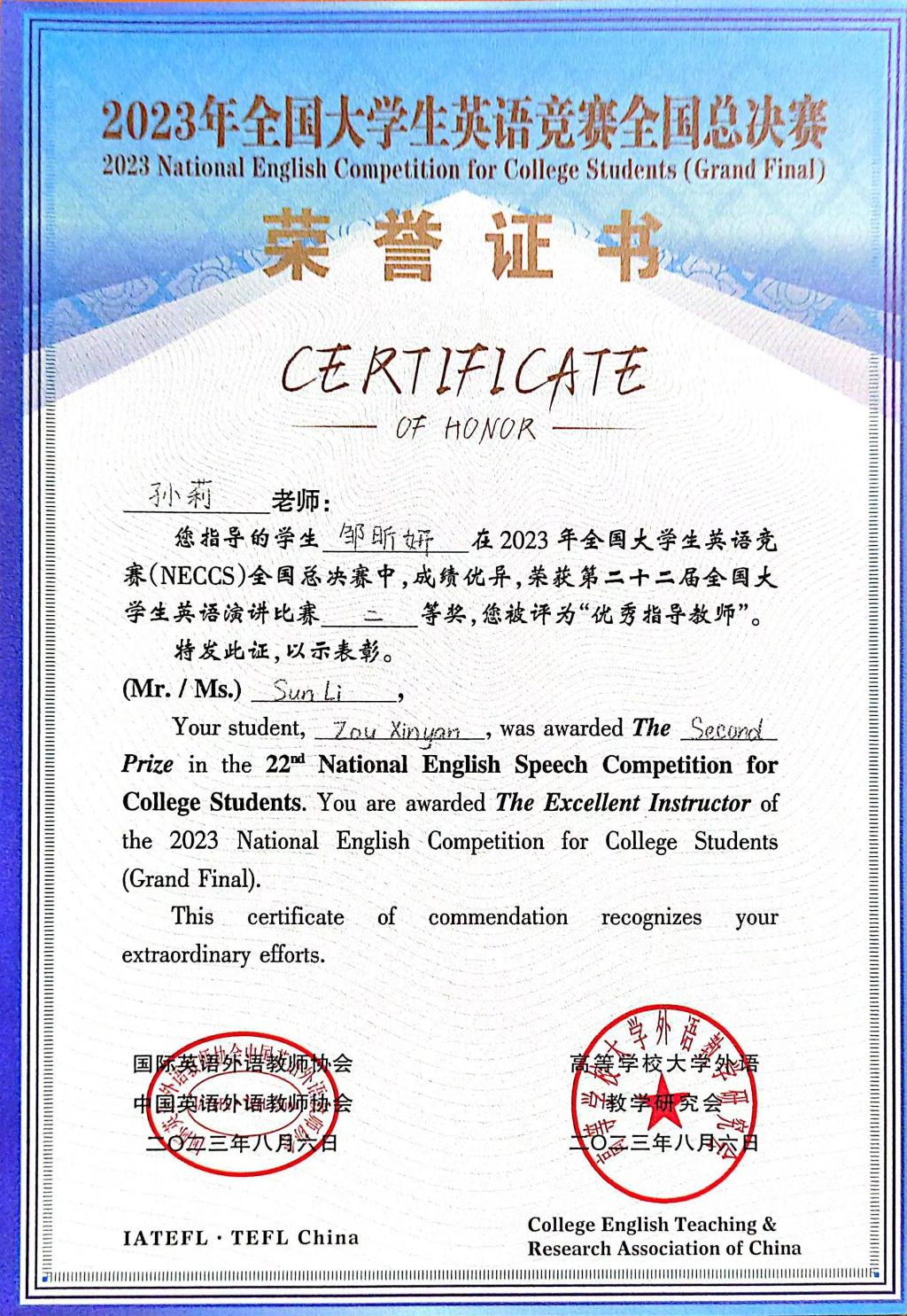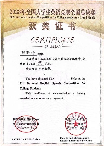 (通讯员 孙莉)8月2日至8月6日,2023年全国大学生英语竞赛(NECCS)全国总决赛在宁夏银川举办,由我院公共外语教学部教师指导的计算机科学与工程学院信息安全专业邹昕妍同学作为吉林省复赛一等奖选手代表参赛。在总决赛中,邹昕妍同学准备充分,沉着冷静,以优秀的临场发挥荣获第二十二届全国大学生英语演讲比赛二等奖、第二十二届全国大学生英语辩论赛三等奖两项荣誉,并在主持人选拔中脱颖而出,参与了英语学习经验交流会的主持工作,被评为“优秀主持人”,基于以上优秀表现,邹昕妍同学被评为“优秀参赛选手”。 同时,我校英国365集团公司教师孙莉作为邹昕妍的指导教师在本次全国大学生英语竞赛中,荣获演讲比赛“优秀指导教师”、英语辩论赛“优秀指导教师”两项荣誉。