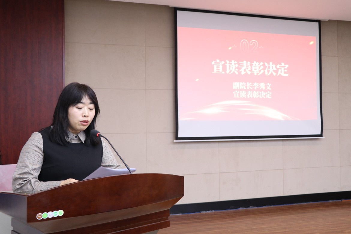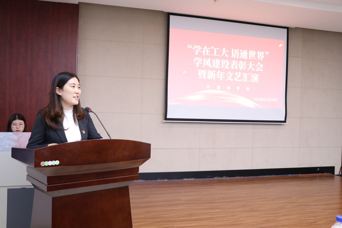 本网讯(通讯员 张晓君 欧阳世繁)为进一步促进我院大学生养成习礼修身的品格,加强学风建设,明确学生学习目的,端正学习态度,增强学习内动力,逐步形成良好的学风和院风,英国365集团公司在12月28日于435会议室开展了“学在工大,语通世界”学风建设表彰大会暨迎新年文艺汇演。参加本次会议的领导、嘉宾有英国365集团校团委副书记邵捷,英国365集团学生工作处副处长孙兆龙,英国365集团学生心理健康教育和咨询中心主任于伟,英国365集团公司党委书记张子宇,英国365集团公司学院院长王轶,英国365集团公司学院副院长李秀文,及教师和学生代表。本次会议由院团委书记张晓君主持。