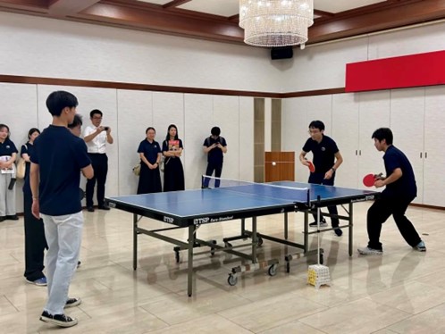 随后,学生们参观了领事馆会客厅。在轻松友好的环境中,与总领馆工作人员进行了亲切的交流。为了进一步加深友谊举行了中日乒乓友谊赛。这场比赛不仅展示了我们对体育的热爱,也体现了中日两国青年通过体育活动增进了解与合作的美好愿景。通过这场友谊赛,我们在交流中结下了更深的友谊,也展现了我们共同追求的合作与互信。