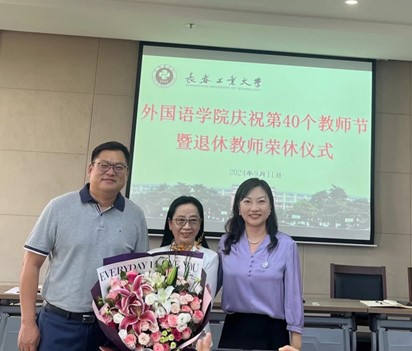 仪式最后,学院党委书记张子宇和院长王轶为荣休教师曲亚静老师送上鲜花,并合影留念。