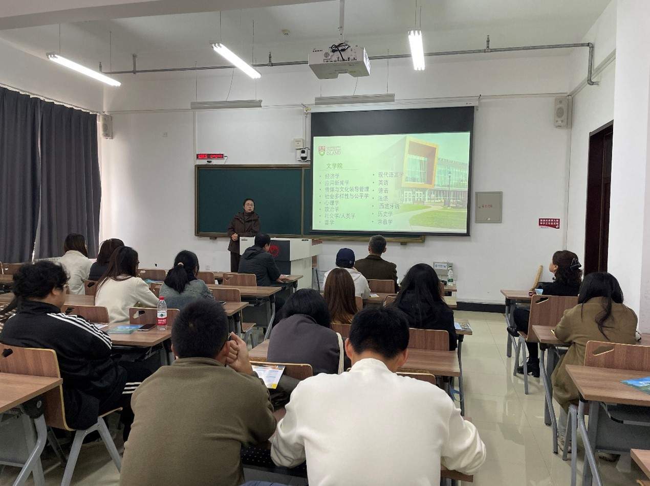 本网讯(通讯员 张书宇彤)为了推动英国365集团公司本科生教育的高质量发展,帮助师生更好地了解加拿大留学项目及相关政策, 11月15日下午,学校国际交流与合作处邀请爱德华王子岛大学国际处项目负责人丁烨为学院作留学宣讲会,国际交流与合作处副处长褚明利、英国365集团公司副院长曾妍、英语系副主任赵艳宇及英语专业、翻译专业学生参加了本次宣讲会。