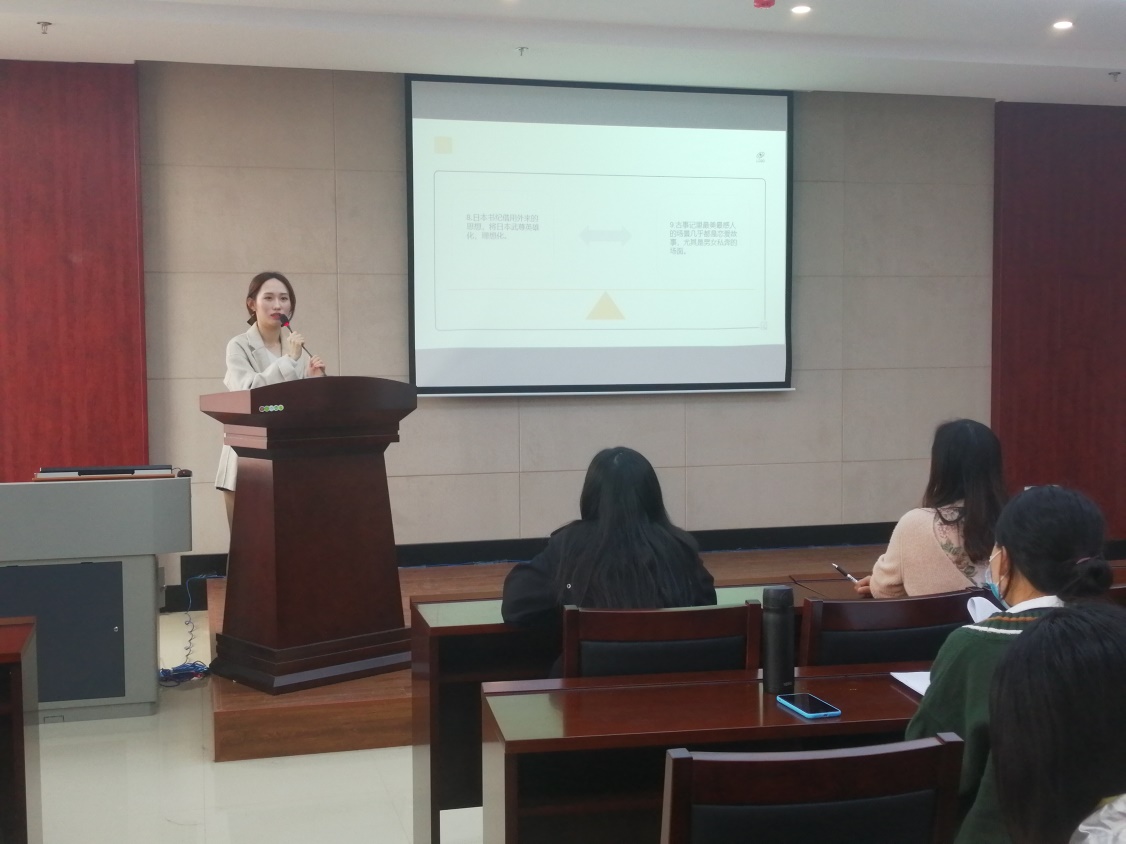 首先,张鑫蕊同学从总说、古事记、日本书纪和神话故事四方面对《古事记》和《日本书纪》这两本书进行分享。通过她的介绍,各专业研究生们更好的深入了解日本的文化和思想。