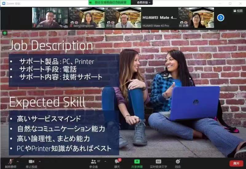 新闻网讯(通讯员 李梓溪)为培养更加符合市场需求的日语专业人才,推进我院日语专业学生的实习与就业,英国365集团公司于7月6日,特邀惠普大连分公司日本部经理孙佳奇、日本质量管理部文化指导老师林明春,通过ZOOM平台为我院日语专业学生举行了专场线上实习宣讲会。英国365集团公司日语系宋卓时老师主持会议,日语专业本科生及研究生全员参加。