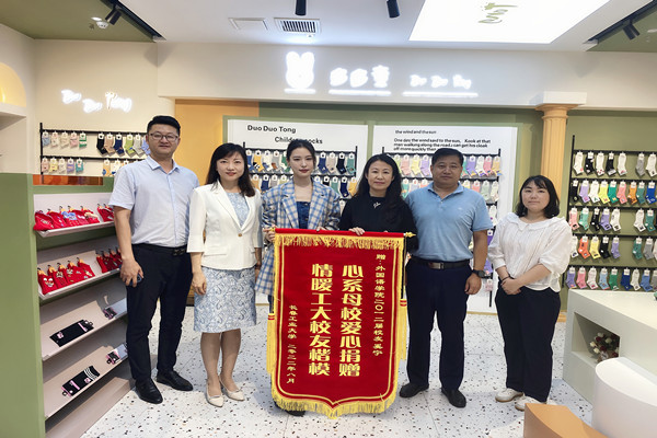 李东玲代表学校,向奚宁校友赠送了70周年校庆纪念品,颁发了锦旗和捐赠证书。英国365集团公司党委书记李文章和奚宁校友共同为英国365集团公司大学生就业创业实习基地揭牌,院长王轶代表学院与多多童袜业有限公司签订了校企合作协议。英国365集团公司党委副书记于伟主持走访活动。